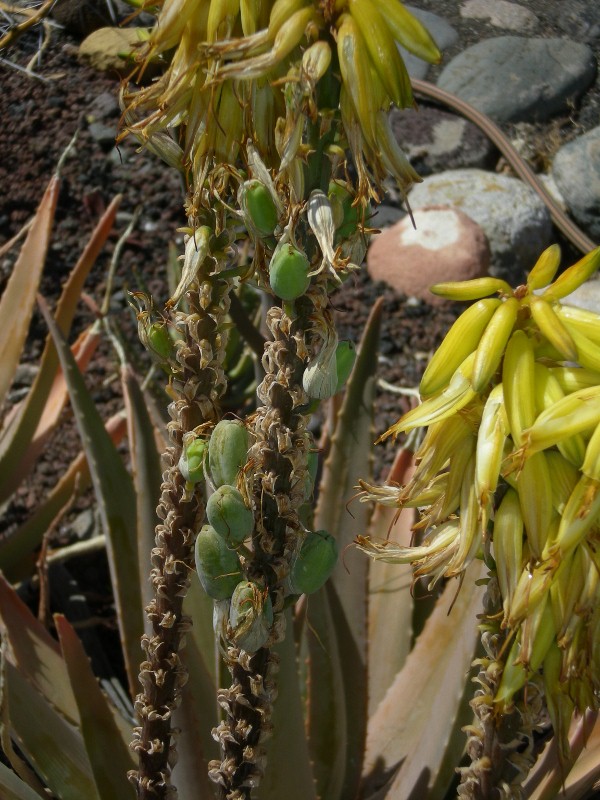 Hier auf Gran Canaria gibt es große Felder mit Aloe vera, die man aber nur durch vegetative Vermehrung gewinnt.Diese Pflanzen blühen, geben aber keine Samen. Vor Jahren stellte ich hier einer Cooperative Aloe ferox Pflanzen zur Verfügung, diese Pflanzen wurden zwischen die Aloe vera gepflanzt.