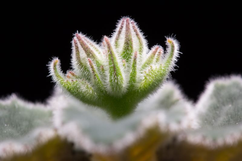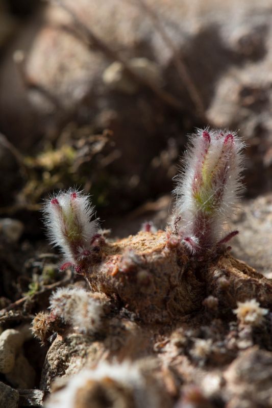 Den aktuellen Nachttemperaturen entsprechend mit reichlich Pelz: Der Neutrieb und dann die Knospen von Sinningia iarae.