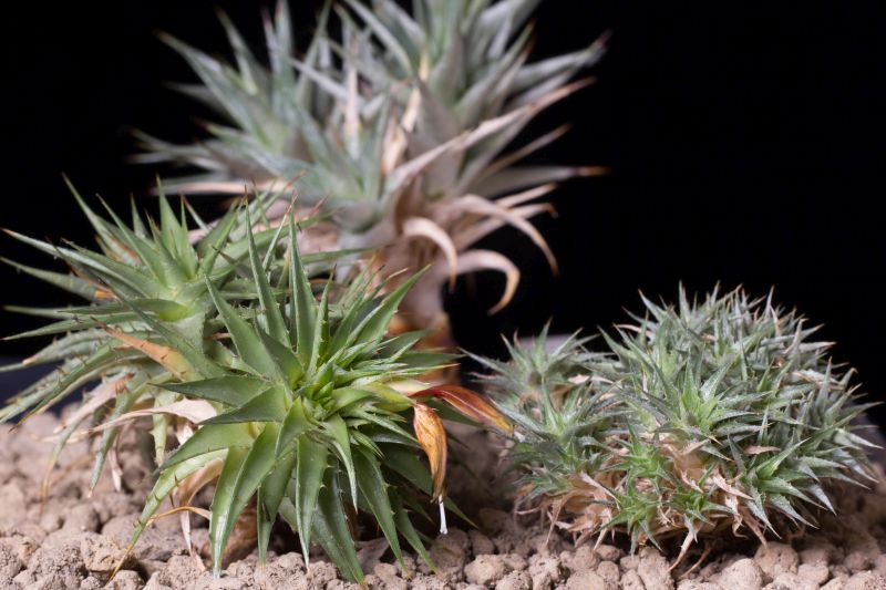Beide vorderen Pflanzen sind Deuterocohnia lotteae (von verschiedenen Fundorten), im Hintergrund ist eine relativ grobe Form von Deuterocohnia brevifolia. Diese Pflanzen habe ich alle erst seit etwa 1 1/2 Jahren und vor Kurzem in einer Schale zusammengepflanzt. Mal schauen, wie schnell sie nun wachsen.