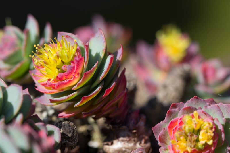 Immer wieder schön: Delosperma 'congestum' (die Anführungszeichen gehören eigentlich um den gesamten Namen, denn diese merkwürdige Pflanze ist nicht einmal ein Delosperma). Gut, dass ich sie gestern aufgenommen habe, heute haben sich diese Blüten gar nicht erst geöffnet. Vor 3 Jahren hatte mir ein ausgebüchster Pfau die Schale mit Lewisia pygmaea vom Balkon geschossen. Die Sämlinge, die ich retten konnte, blühen nun erstmals. Nix botanisches, sondern "nur" Gartenhybride, aber mit tollem Farbspiel: Lewisia cotyledon X Ungewöhnlicher Farbkontrast: Vermutlich durch die kalte Witterung der letzten Zeit sind die Blätter bei Rhodiola rosea rot überlaufen. Normalerweise blüht Rhodiola pachyclados bei mir ab Ende April. Dieses Jahr werden die Blüten noch ein bisschen auf sich warten lassen. Keine klassische Sukkulente, passt aber m.E. trotzdem gut hierher: Walzenwolfsmilch Euphorbia myrsinites Bis neulich