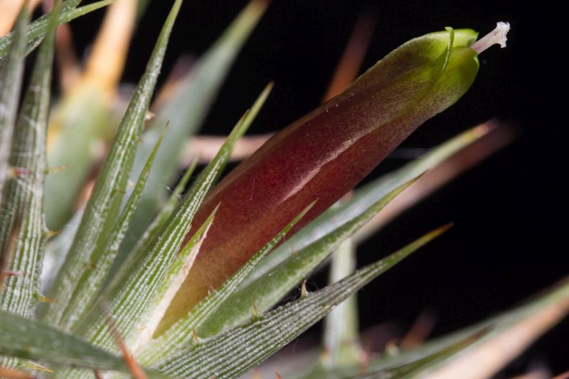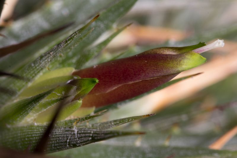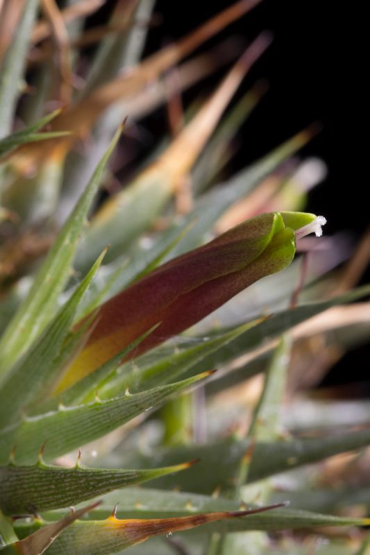 Wer die Pflanze nicht kennt: Es ist eine Polster bildende Zwerg-Bromelie. Die Blüten sind etwa 5 cm lang. Bekannter ist wahrscheinlich die grün blühende Art Deuterocohnia brevifolia, vielleicht noch unter dem alten Gattungsnamen Abromeitiella.