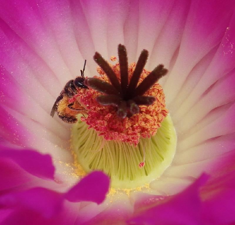 Während meiner "Fotosession" kam diese Wildbiene angeflogen, setzte sich auf die Staubbeutel, raffte sich 6 beinvoll Pollen unter den Bauch um sich dann anschließend mit dem Staub wieder aus demselbigen zu machen ... .