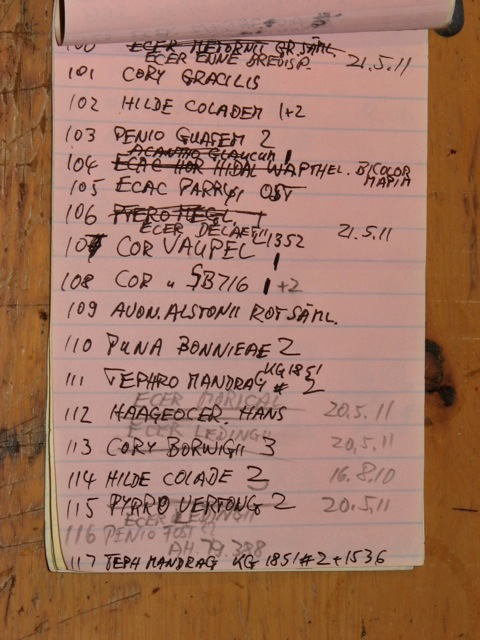 - Dokumentieren: Zur jeweiligen Nummer werden Pflanzenname und Datum auf einer Liste eingetragen. (Was sicher ordentlicher aussehen sollte als bei mir!)