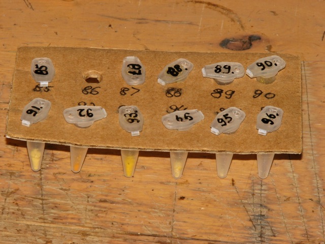 - Abfüllen: Ich benutze dafür vorher nummerierte 1,5 ml Probenbehälter (Plastik mit Deckel) aus der Analytik, in die ich die Pollen vom Papier mittels Pinsel einfülle.