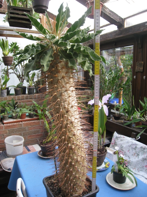 Vor etwa vier Jahren kaufte ich mir dann eine wurzelechte Jungpflanze, die jetzt etwa 10 cm Höhe erreicht hat. Die Pflege ist recht einfach, wenn man versteht, was die Pflanze will. Das gilt eigentlich für alle Pachypodium-Arten, die ich bisher hatte. Also, sobald sich die Blätter verfärben und abfallen, volkommen unabhängig vom Kalender, wird nicht mehr gegossen. Wasser gibt es erst wieder, wenn neue Blätter kommen. Sie hat die Tendenz zum Winterwachser - derzeit steht sie also ohne Blätter da. Sie hat aber auch schon mal zwei Vegetationsperioden in einem Kalenderjahr hingelegt. Bei Wachstum gibt es ordentlich Wasser und auch Dünger, zwischendurch trocknet das Substrat aber immer wieder ab. Knochentrocken wird es aber nie während des Wachstums! Im Winter steht sie minimal bei ezwa 3 °C mit anderen Winterwachsern, vorsichtig bewässert, unter Assimilationslicht.