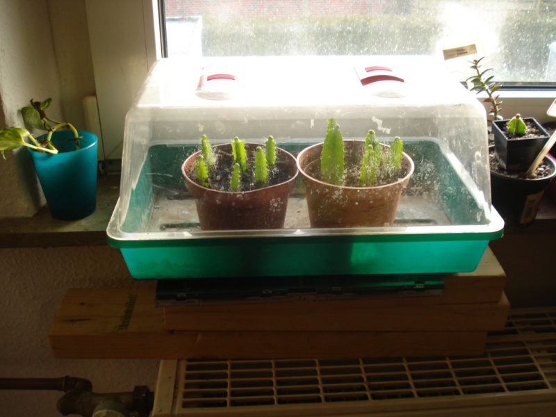 Die Pfropfungen stehen jetzt bei 20-22 Grad am Südfenster mit Kunstlicht. Sämlinge auf Seleni wachsen hier an, die auf Hylos hoffentlich auch.