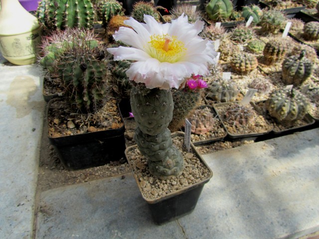 meine größere Pflanze von Tephrocactus geometricus ist nun auch zur Blüte gekommen, vobn der Farbe her etwas rosa mehr wie die kleineren.