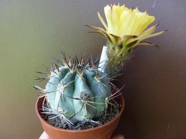 Hier ist das gut bekannte Acanthocalycium glaucum, das einen graurün bereiften Körper hat und kräftig gelb blüht: