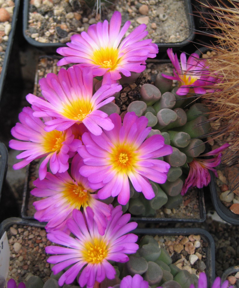 wie jedes Jahr blüht derzeit wieder Frithia pulchra. Diese sehr aparten Blüten erinnern mich immer irgendwie an die Blüten von Mammillaria luethyi.