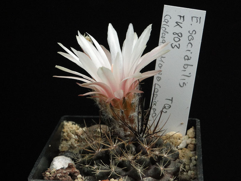 Diagnostisch wertvoll sind die dunkelbraunen Borsten am Blütenkelch bei E. recondita ssp. recondita. Dieses Taxon beinhaltet Pyrrhocactus reconditus und P. vexatus (Ritter). Sie kommen beide in der Umgebung der Stadt Antofagasta vor. Man erahnt die Rübenwurzel