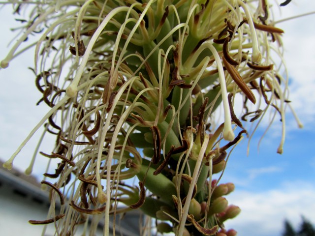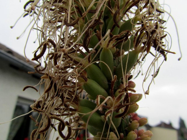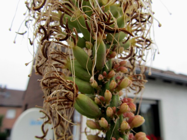 Die Pflanze sah sehr mitgenommen aus, ich habe den Blütenstand abgesägt und in ein Glas Wasser gestellt vieleicht werden doch noch ein paar Samen reif.