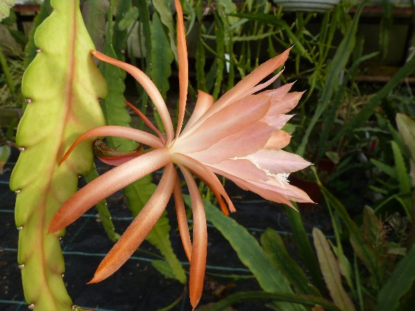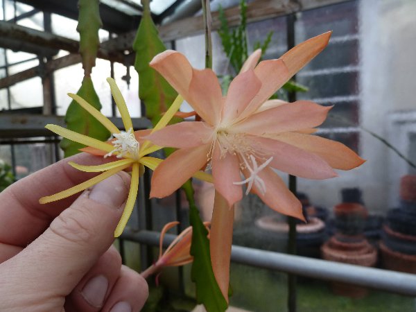 Hallo Arnhelm, deine Züchtungen mit D. macranthus sehen ja schön aus. Gut am D.macr. ist, das er im Herbst/ Winter blüht. Darum habe ich ja auch einige Züchtungen damit gemacht. Aber nicht direkt mit der Wildpflanze, sondern mit Hybriden, wie zum Beispiel George´s Favorite, die davon abstammen. Zur damaligen zeit hatte ich noch keinen macranthus. Es gibt ja verschiede Klone von dieser Art. Petersen züchtete mit der Aufsammlung von Lau (Lau 1263) Dieser blüht miesstens nur im Frühling. Ich habe zalreiche Sorten gezüchtet, die mehrmals im Jahr blühen können. Reine Winterblüher habe ich auch, diese stammen von Epiphyllum anguliger ab. Durch einkreuzen mit George´s Favorite ist es mir gelungen die eigendlich E. anguliger Blütezeit zu strecken. Meine 6 Registrierten Züchtungen dieser Aussaatreihe bescheren mir den ganzen Winter immer wieder Blüten. Andere Züchtungen mit E. anguliger blühen auch im Winter, aber nicht so reichlich. Aber jede Blüte ist im Winter Willkommen. LG Rudolf