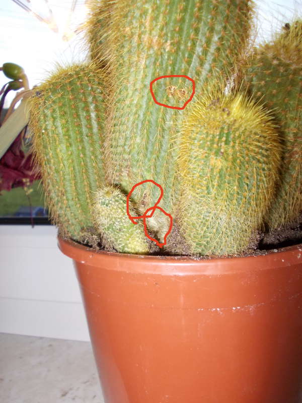 ich habe wieder einen neuen Kaktus, weiß auch nicht genau, wie er heißt, ich vermute aber in Richtung Haageocereus. Er ist ganz unten unter der Erde verzweigt, und hat ganz oben auf den Spitzen Cephalium. Ich habe ihn aus Mitleid gekauft, da er in einen Topf mit 10 cm Durchmesser getopft war, ich habe ihn in einen Topf mit doppeltem Durchmesser umgetopft. Er ist an einigen Stellen allerdings etwas weich, was mich wundert. Er hat auch einige Verkorkungen, und unten ist er ganz grau, was aber ganz hart ist. Die weichen Stellen sind ungefähr 5 cm über der Erde, und sie haben ungefähr 2-3 cm Durchmesser. Bei einigen sind in der Mitte dunkelbraune, katzenaugenförmige Stellen, das Braune ist in einer Art Kerbe drin und bedeckt deren Innenseite. Das Braune ist nur 1mm dick, darunter ist grün. Die weichen Stellen sind normalfarben. Einige Stellen auf dem Kaktus sind auch eingedellt.