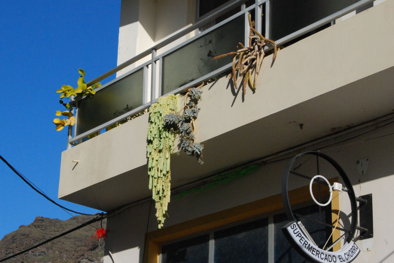Balkon in La Calera, Valle Gran Rey: v.l.n.r Hylocereus (?), Sedum morganianum, Graptopetalum spec. (blühend), Selenicereus (?) - offensichtlich etwas gestresst