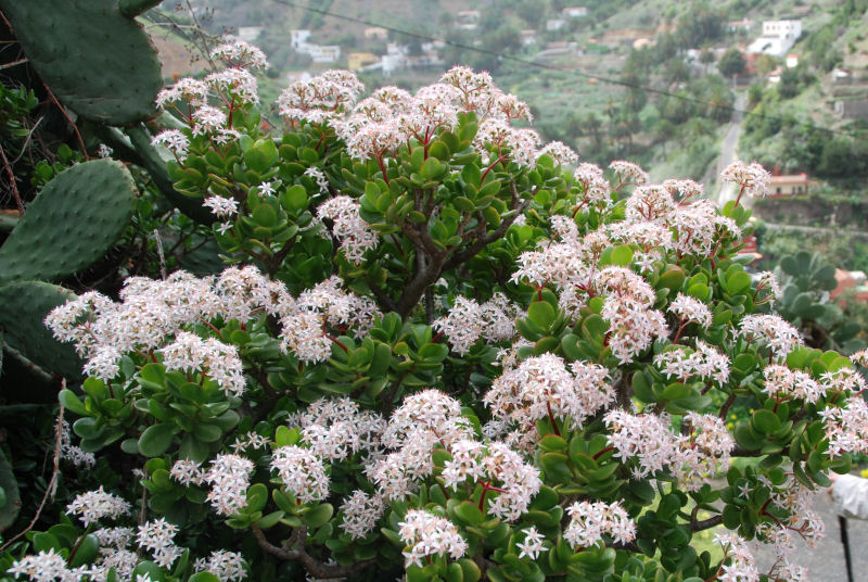 Vorgarten in Vizcaina, Valle Gran Rey: Crassula ovata in Blüte