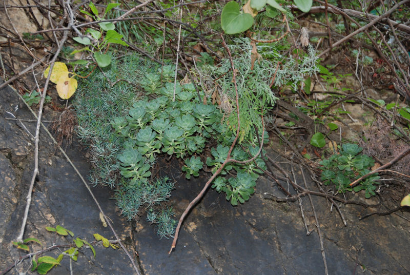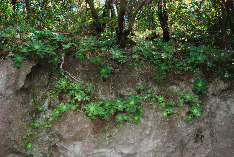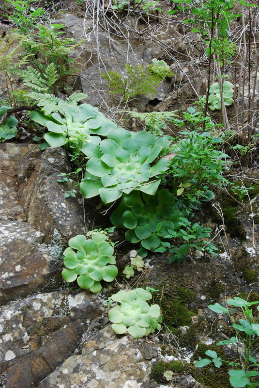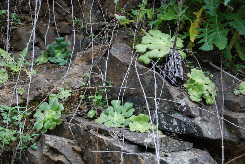 Aeonium spathulatum (oder A. saundersii?) ist mir an einer Stelle, südl. Vallehermoso, nahe Cruz de la Cuesta aufgefallen. Fast senkrechte Wand (wie übrigens meistens Aeonien in den Wänden zu finden sind), Ausrichtung nördlich, schattig. Die Art ist als kleiner Halbstrauch zu bezeichnen und auf allen Kanareninseln außer Lanzarote und Fuerteventura zu finden.