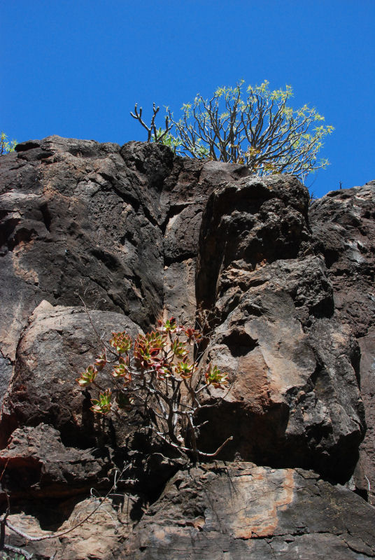 Aeonium holochrysum ist eine verzweigte, weit verbreitete Art, die mit einer sehr langen Blütezeit von November bis Juni auch Winterurlaubern auffallen kann. Warum ich keine blühende Pflanze fotografiert habe, weiß ich auch nicht … Sie steht oft in Felswänden in der vollen Sonne - wo da das Wasser herkommt?