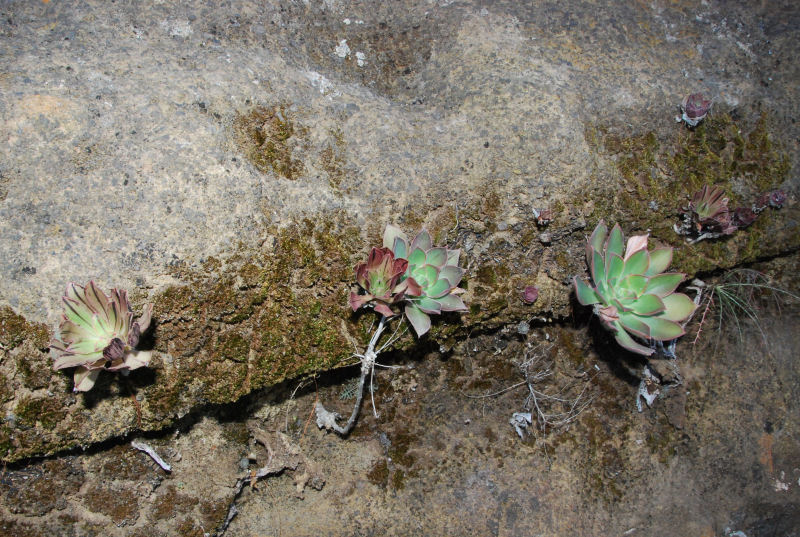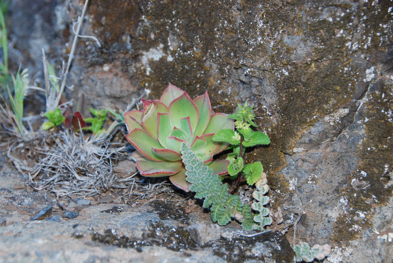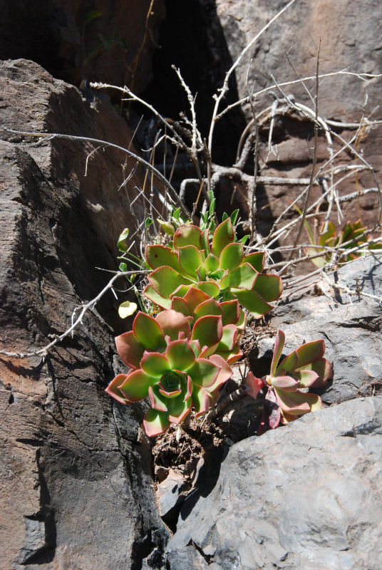 Nun also zu den zwei Gomera-Endemiten aus der Gattung Aeonium: Zunächst A. decorum, das zierliche Aeonium. Es ist anhand der relativ geringen Größe (5-10 cm Durchmesser der Rosetten) und der Blütenfarbe weiß-rosa zumindest in der Blütezeit gut zu erkennen. Die kleinen Halbsträucher sind stark verzweigt, die Blätter meist rötlich überlaufen. Es wächst auf trockenen Felsstandorten, wo uns aber immer nur wenige Pflanzen begegneten (es war zugegeben auch keine Aeonium-Safari, bei der ich darauf fixiert war die Arten zu dokumentieren). Das Foto entstand oberhalb von Taguluche, Westküste, in einer süd-westlich ausgerichteten Steilwand – das Bild ist nicht verdreht, der Ast wuchs tatsächlich waagerecht aus dem Fels …