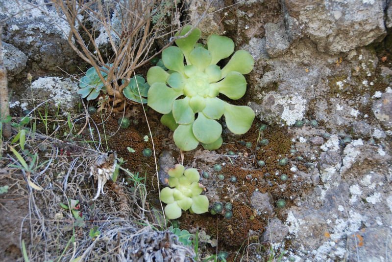 Auf La Gomera gibt es nach Angaben des Naturführers „Die Kosmos-Kanarenflora“ etwa acht unterschiedliche Arten, davon zwei Gomera-Endemiten. Unterwegs auf der Insel ist es oft schwierig, manche Arten sicher anzusprechen, besonders wenn es sich um kleine unverzweigte Exemplare handelt. Und im Nachhinein geht es gar nicht. Leider ist die Blütezeit der meisten Aeonien auch erst ab März, so dass ich im Februar kaum Blüten sah und diese sowie die Struktur des Blütenstands als Anhaltspunkt nutzen konnte. So kann ich nicht behaupten A. palmense (auf La Palma und La Gomera zu finden) und A. urbicum (Tenerifffa und La Gomera) gesehen zu haben. Nicht aufgefallen ist mir A. sedifolium, deren Vorkommen auf La Gomera aber fraglich ist.
