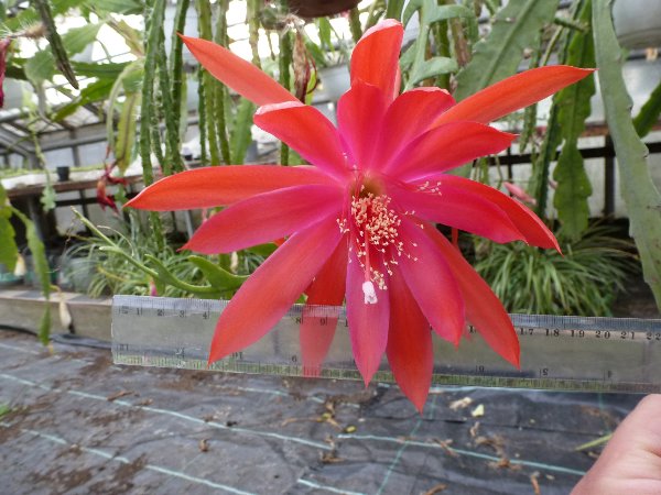Hier zeige ich mal Bilder von meiner bisher größten Blüte, die ich an einem Aporophyllum hatte. Die Sorte heißt Evita und die Blüten erinnern schon sehr an eine Epi-Blüte, vor allem den Petersen-Frühlingssorten sieht sie recht ähnlich.