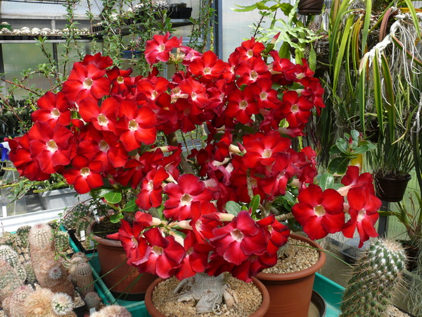 heute mal ein neues Bild von der diesjährigen Hochblüte meiner Adenium-Hybride ohne Namen. Inzwischen hat sich die Pflanze in meine Kultur eingeschickt und belohnt mich mit dieser Blütenfülle. Im Winter hat sie alle Blätter abgeworfen und diese sind mit der heller werdenden Jahreszeit alle wieder gewachsen und dazu massenhaft Blütenknospen.