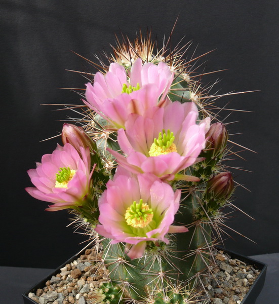 die trockene, kalte und frostige Überwinterung der frostfesten Echinocereen hat den Pflanzen wohl sichtlich gut getan. Inzwischen haben sie nach dem Wässern Anfang April auch ihre alte Wuchshöhe erreicht und jetzt beginnt bei allen das neue Wachstum, sichtbar durch die Neubildung von starken Dornen. Bedingt durch die Kälte (? - Ich führe es darauf zurück) haben sich an allen blühfähigen Pflanzen kräftige und mehr Knospen als im Vorjahr gebildet, die jetzt langsam beginnen sich zu öffnen.