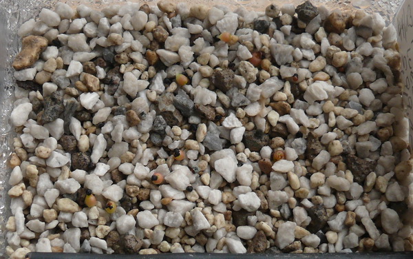 Ich bereitete die Aussaat vor, zu dem Zweck nahm ich eine Plastikdose, wo vorher „Goldkugeln„ von einer Schoko-Firma drin waren. Diese nehme ich gerne für Aussaaten, da sie ziemlich dicht schließen. Es wurde etwa 3 cm hoch weißer griechischer Bims eingefüllt, der vorher in der Microwelle 10 min. sterilisiert wurde. Anschließend habe ich die Samen in einem verschließbaren Probenröhrchen mit konzentrierter Schwefelsäure nur 5 Minuten durchgeschüttelt, da sich die Säure schon sehr bald schwärzlich verfärbte und ich Sorge hatte, dass 10 Minuten zu lang sind. Zum Einfüllen der Säure in das Röhrchen benutze ich eine Injektionsspritze. Anschließend habe ich das Röhrchen mit den Samen in viel Wasser entleert und diese gründlich gewässert und gespült, auf Küchenpapier getrocknet und ohne Beizung ausgesät.