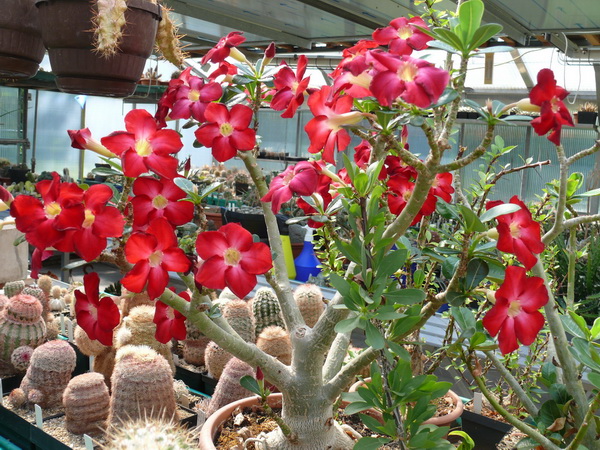 Meinem Adenium obesum Hybrid aus Mexico geht es schon viel besser. Er hat zwar im Winter fast alle Blätter verloren und auch, ich weiß nicht woher, einige Schildläuse gehabt. Wahrscheinlich habe ich die mit eingeschleppt, sie sind aber jetzt alle eleminiert. (ich hoffe es) Inzwischen hat die Pflanze gut Dünger (Wuxal) bekommen und fängt auch wieder an zu wachsen und neue Blätter zu bekommen. Vor allen Dingen sind auch die ersten Blüten da, die besonders bei dieser Pflanze so intensiv rot sind, daß das bei Sonne richtig in den Augen brennt. Nur ein stärkeres Längenwachstum der Zweige vermisse ich noch. Auf der Raritätenbörse in Essen wurden Pflanzen angeboten, die ein enormes Längenwachstum zeigten. Aber das waren Pflanzen aus gärtnerischer Kultur, evtl. mit viel Dünger??