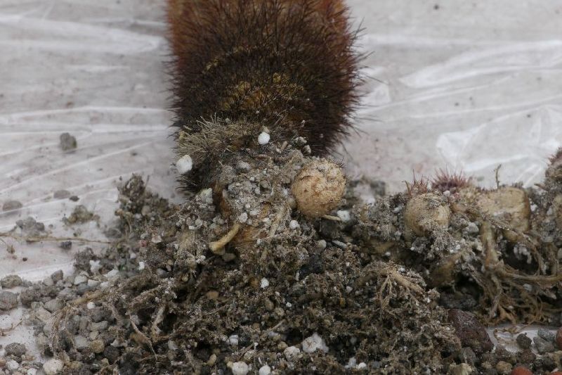 das sind definitiv keine Nematoden-Gallen, sondern Sprosse. An den etwas weiter entwickelten kann man schon die Struktur des Kakteenkörpers erkennen (Bild 1 über dem Objektivdeckel), oder täusche ich mich da?