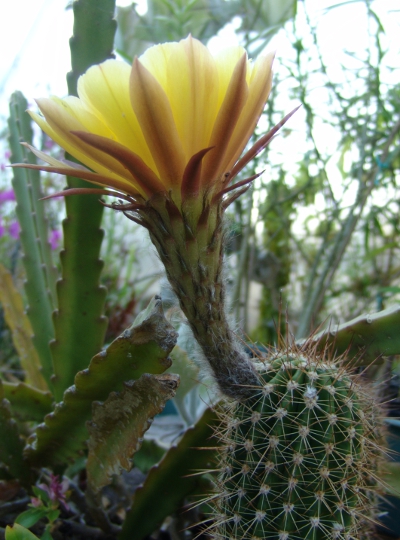 Die erste wächst sehr schlanksäulig, hat feinere und dichtere Dornen und eine große gelbe Blüte: