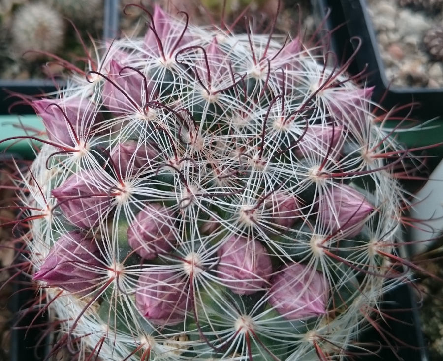 hier Knospen an Blossfeldia: und fette Knospen an Mammillaria longiflora: und noch Knospen an Mammillaria perezdelarosae subsp. andersoniana:
