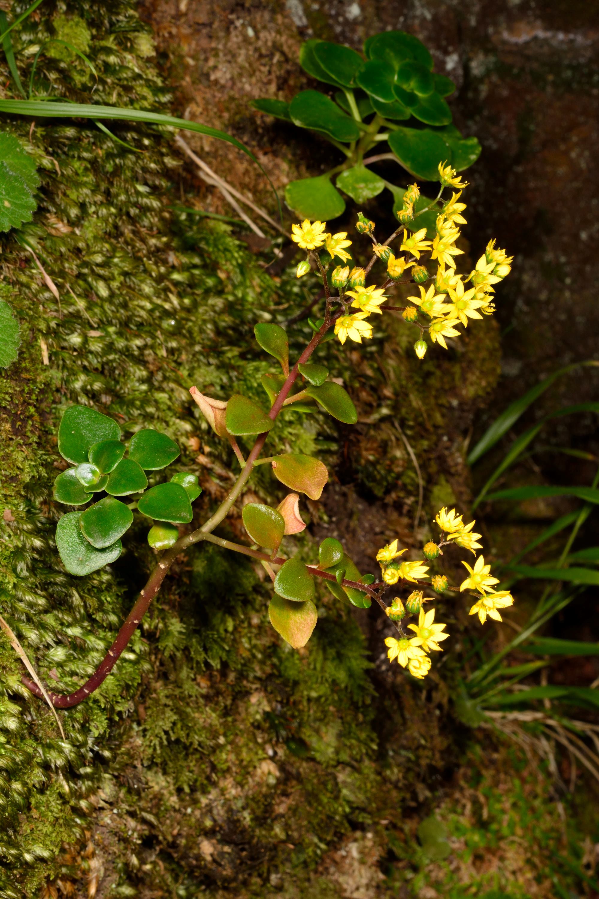Aeonium glutinosum, das Kleb-Aeonium, macht seinem Namen alle Ehre. Es ist ein Kleinstrauch mit sehr sparrigem Blütenstand, recht weit verbreitet auf der Insel, meist an südlichen Hängen und Steilwänden. Aeonium glandulosum ist eher an nördlich ausgerichteten Steilwänden zu finden. Es ist mehr oder weniger tellerförmig und erinnert etwas an A. tabuliforme (Teneriffa) oder A. canariense var. subplanum (La Gomera). Die Art ist in den Bergen bis 1700 m verbreitet und kann dort an für Mensch und Ziege unerreichbaren Felswänden Massenbestände bilden. Beiden Aeonien blühen gelb ab Juni. Sedum nudum ist relativ häufig an sonnigen Felswänden zu finden. Das sehr ähnliche Sedum brissemorettii ist deutlich seltener und wächst an schattigeren Orten. Beide blühen gelb. Sedum farinosum ist eine sehr schöne, weiß bereifte und weiß blühende Art, die nur in den Hochlagen wächst. Blütezeit aller genannten Arten ist ebenfalls ab Juni / Juli. Eine weitere Art, Sedum fusiforme, ist sehr selten und ich habe es in der Natur nicht gefunden. Die ein- bis zweijährigen Aichryson-Arten wachsen an schattigen, eher feuchten Orten, durchaus auch in größeren Höhen. Die Sukkulenz ist nicht nur schwach ausgeprägt. Das behaarte Aichryson villosum kommt auch auf den Azoren vor, wohingegen das kahle Aichryson divaricatum und Aichryson dumosum endemisch sind. Letztere ist so geschützt, dass es keinerlei Auskunft zum Wuchsort gibt. Aichryson villosum wird nur wenige Zentimeter groß und ist wie das deutlich größere und vielblütige Aichryson divaricatum an eher schattigen, feuchten Stellen, oftmals an senkrechten Wänden im Lorbeerwaldbereich zu finden. Man findet sie aber auch in den Hochlagen an Felsen meist an schattigen Orten. Die gelben Blüten erscheinen im Sommer. Interessanterweise findet man auf der trockenen Halbinsel São Lourenço kaum sukkulente Pflanzen (an einigen Stellen Mesembryanthemum sp.), sondern eher Gräser und trockenheitstolerante, aber nicht sukkulente Pflanzen.