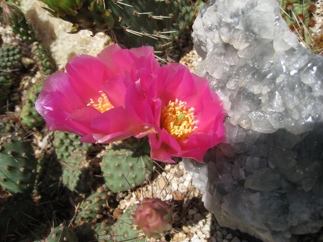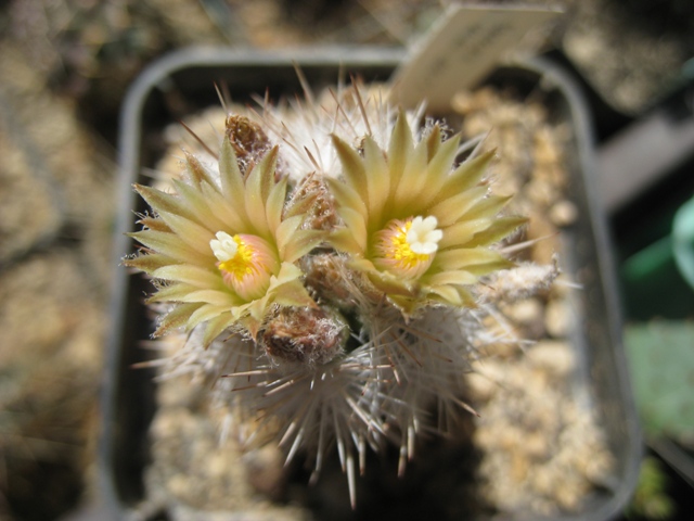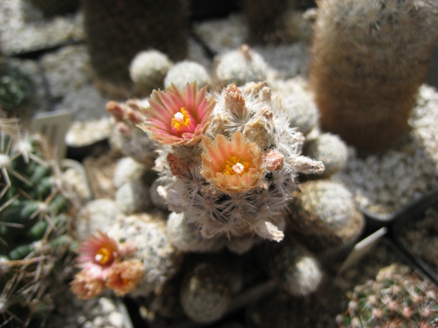 Hallo, den Winter mit bis zu minus 23°C haben meine Pflanzen mehr oder weniger gut überstanden. Erfreulich das ein von mir im April 04 ausgesäter Echinocereus reichenbachii v. baileyi das erste mal blüht. Die Escobarie missouriensis war tief eingesenkt und stark geschrumpft, die Strategie war die richtige wie die Blüte zeigt. Den gestrigen Sonnenschein habe ich genutzt um die Aufnahmen zu machen bevor der Regen die Blüten entstellt.