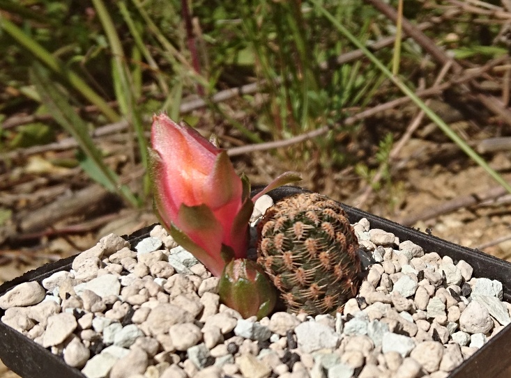 inzwischen blühen bei mir 3 von 4 Pflanzen...und AW schreibt dazu auf seinen Webseiten: Interessanter Fund von Rolf Bertz in Argentinien. Die Knospen sind nackt wie bei Sulcorebutia, die Blüte entspricht einer Mediolobivia. Blütenfarbe gelb,orange,rot