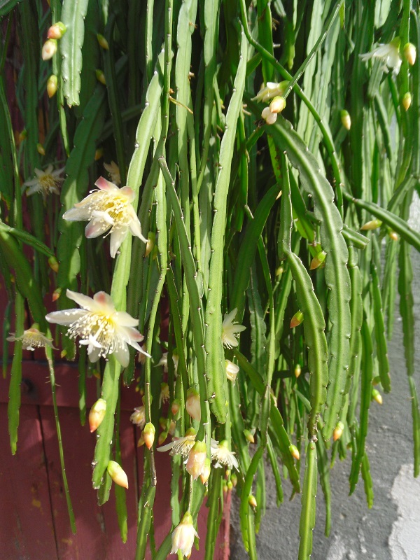 Die Pflanze setzte schon im Winterquartier im kühlen Flur viele Knospen an, jetzt habe ich sie rausgehängt, es friert hier ja nicht mehr.
