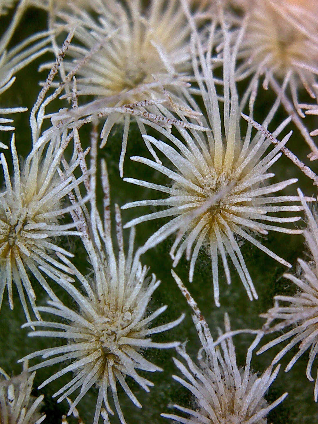 Wohl mit eine der schönsten, wenn auch nicht der einfachsten Epithelanthen. Leider noch nicht gültig beschrieben, da der Standort noch immer unbekannt ist. Bekannt ist nur, daß New Mexico Cactus Research, sprich Horst Künzler, die Pflanzen seinerzeit auf dem Markt in Terlingua, TX gekauft hat. Er sagt, Mexikaner hätten die Pflanzen immer mal wieder über die damals recht offene Grenze gebracht und die Pflanzen hätten immer schwarze Erde an den Wurzel gehabt.
