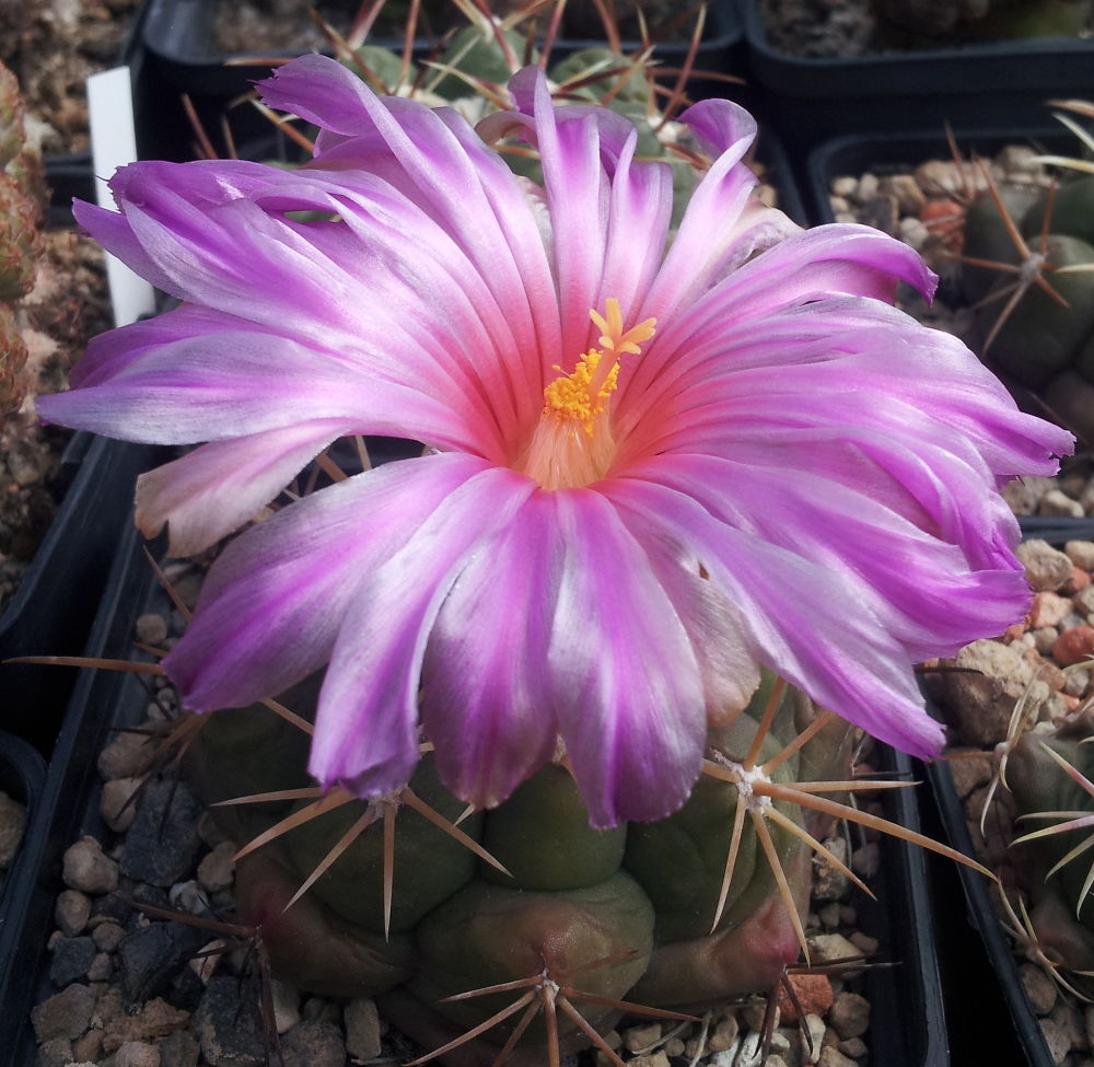 Bei mir hat dieses Jahr zum ersten mal ein Thelocactus lausseri geblüht, und ich dachte wirklich zuerst, wie die Blüte es wohl ohne durchlöchert zu werden durch das dichte Dornenkleid schaffen soll.