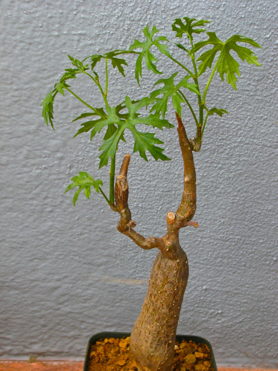 Hat Jatropha ähnliche Blätter, aber nach Verletzung quillt weder gelber oder weißer noch überhaupt Saft aus der Pflanze.