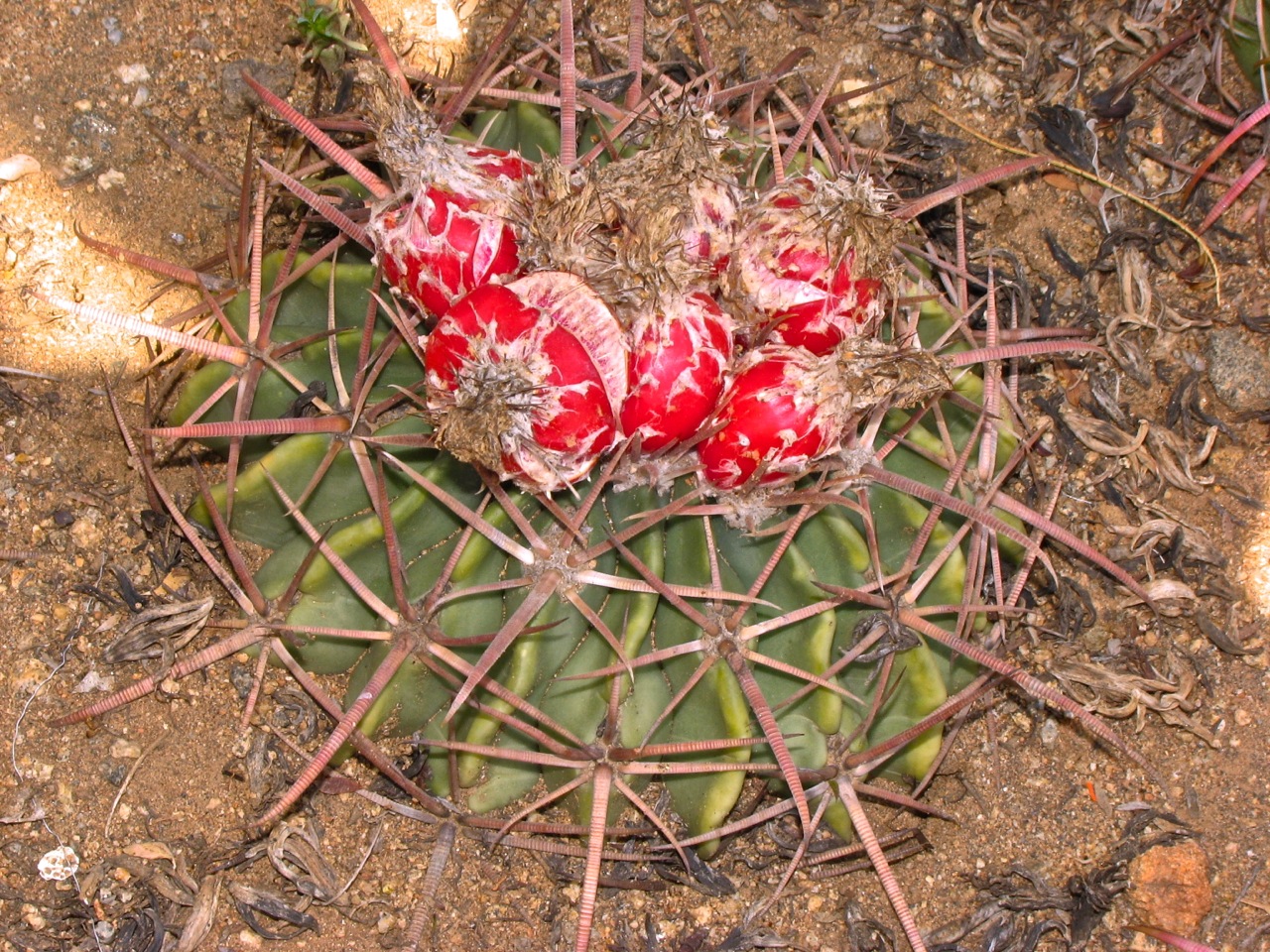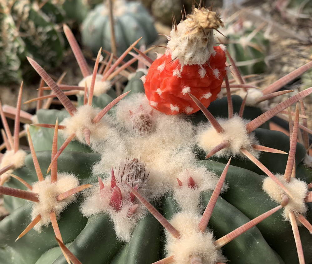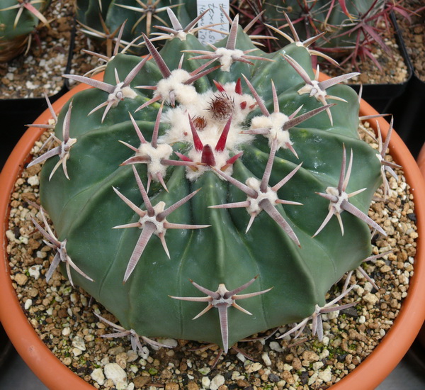 Eine Pflanze, die ich aus der Gärtnerei von Miles Anderson bezogen habe. Ohne Blüte könnte man sie glatt für einen Ferocactus latispinus halten: