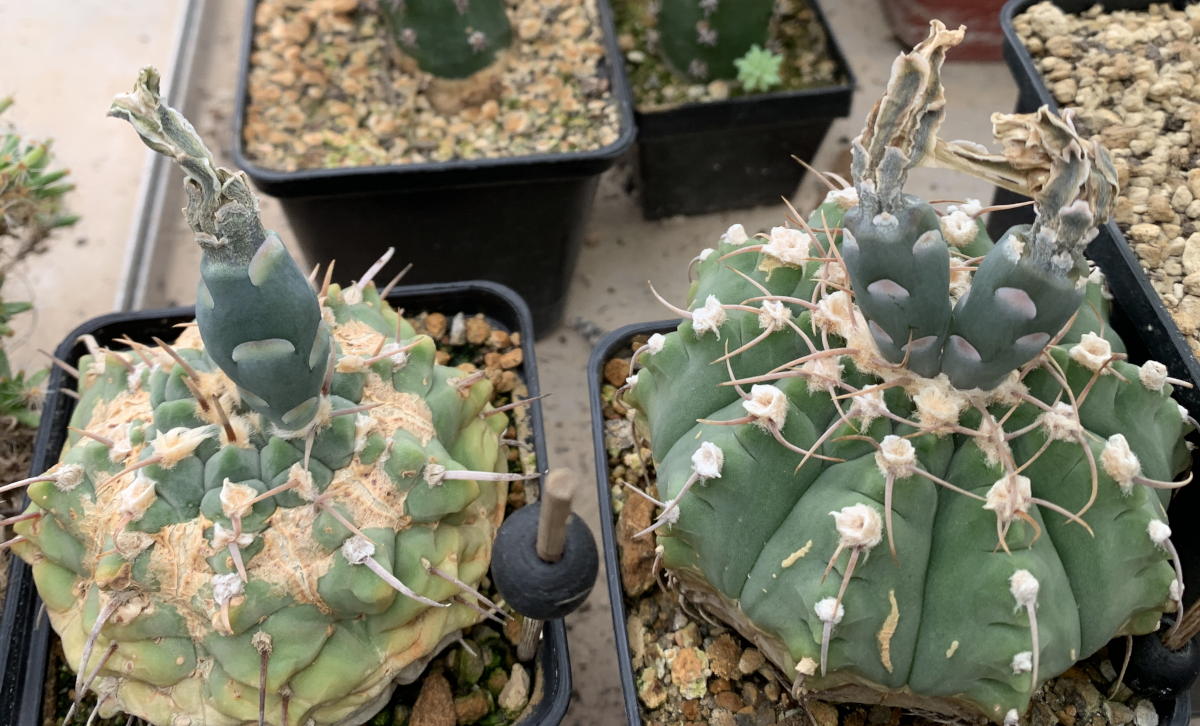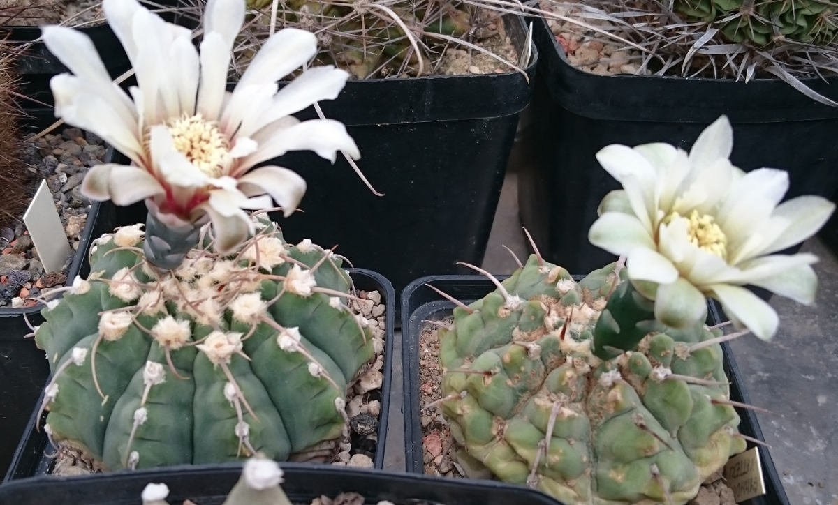 Die linke Pflanze hatte erst einen einzelnen Mitteldorn, macht aber nun neu 3 Dornen pro Areole!? Weiterhin ist die Blütenröhre eher dunkelviolett.