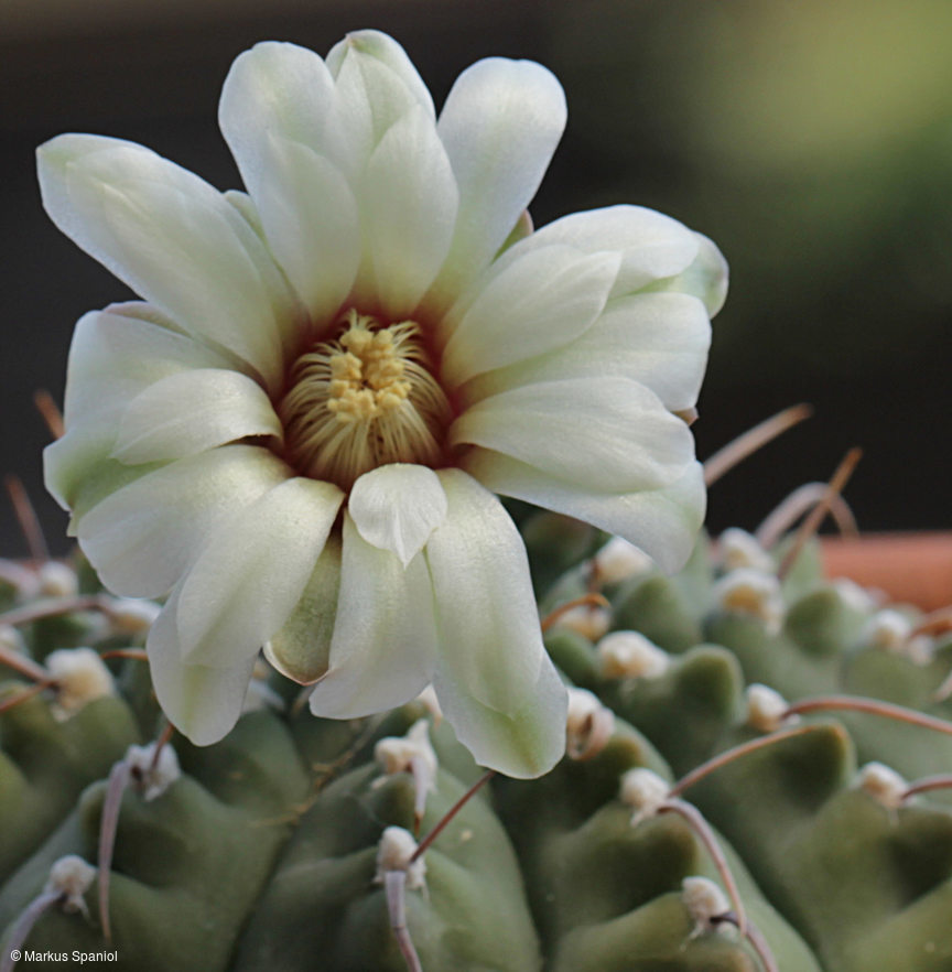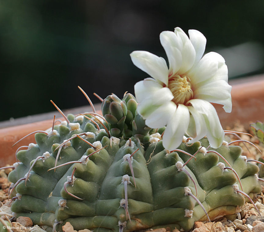 Trotz der großen Hitze und Standort mit voller Sonneneinstrahlung, öffnet Gymnocalycium ochoterenae subsp. vatteri (gekauft 1995) erst am Nachmittag seine Blüten.