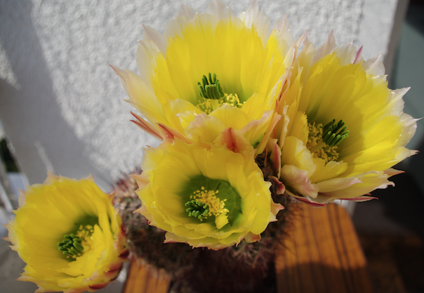 Gekauft habe ich ihn Mitte der achtziger Jahre bei der Herrn Schaurig, als er noch regelmäßig nach BS kam, er dürfe jetzt etwa dreißig Jahre alt sein. Leider ist mir damals auch das Namensschild verloren gegangen. Ich wusste aber noch das er winterhart ist. Er stellte sich als sehr blühfaul heraus, oder ich behandelte ich nicht richtig. 2017 bekam er dann das erste mal eine Blüte, nach der Blüte 2018 bekam er dann zwei Neutriebe, jetzt ist er rund zwanzig Zentimeter lang bei einem Durchmesser von knapp sechs Zentimeter, die Neutriebe etwas vier Zentimeter lang. Dieses Jahr bekam der dann vier schöne gelbe Blüten , deren äußeren Blütenblätter einen roten Mittelstreifen haben. Die Blütendauer beträgt etwa sieben Tage, wobei sich die Blütenfarbe am letzten Tag vor dem verblühen von gelb in altrosa verfärben.