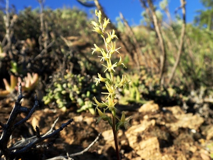 Von Springbok aus nehmen wir die direkte Straße nach Westen Richtung Kleinzee. Nach etwas mehr als einer Stunde Fahrt legen wir den ersten Fotostopp ein. Es ist immer noch sonnig und windstill, also bestes Fotowetter. Wir finden auch gleich ein paar für uns neue Pflanzen, etwa eine Ornithogalum- und eine Lapeirousia-Art. Wir halten uns über eine Stunde auf und finden immer noch Neues. Aber um 10.00 Uhr reißen wir uns los und setzen die Fahrt fort. Schon nach 20 Minuten halten wir an einem frei stehenden Granitberg erneut an und klettern den Hang hinauf.
