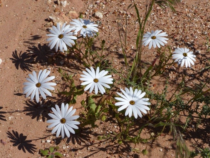 Wir befinden uns in der Übergangszone von den Trockengebieten zur Fynbos-Vegetation, gleichzeitig mit unterschiedlichsten Gesteinen die hier ihre eigene Landschaft formen. In Nieuwoudtville grenzen verschiedene Ökosysteme aneinander, die aus allen vier Himmelrichtungen einwirken. Im Nordosten ist es das Bushmanland, im Nordwesten ist es die Knersvlakte, die zur Sukkulentenkaroo gehört, im Westen liegt eine Gebirgsformation, das sogenannte Bokkeveld Plateau und von Süden her schwappen nördliche Ausläufer der Fynbosvegetation, genauer gesagt des Renostervelds, herüber. Aus dieser Mischung ist das Hantam-Roggeveld Endemismus-Center der ganz besonderen Art mit ca. 1350 Arten entstanden, in dem es weltweit die größte Dichte an Geophyten (ca. 300 Arten) gibt, also Zwiebel-, Knollen- und Rhizompflanzen. Sie ziehen sich zur Ruhezeit in den Erdboden zurück und kommen in der Regenzeit zusammen mit Massen von Einjährigen zur Blüte. Der Wandel der Vegetation und der Landschaften findet hier oben manchmal auf nur sehr wenigen hundert Metern statt.