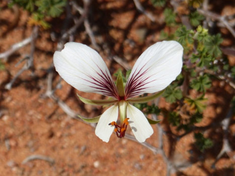 Monsonia crassicaulis bringt wenigstens etwas Farbe in eine ansonsten braune Landschaft.