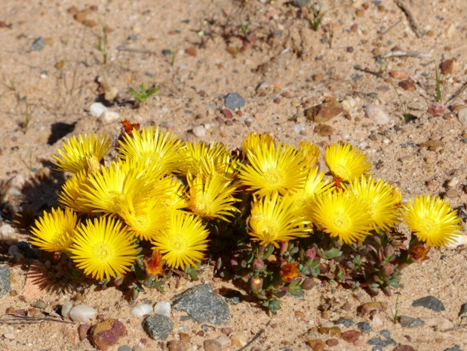 Das Wetter ist sehr warm und fast windstill, aber die Natur erscheint hier oben trotzdem recht frisch. So erleben wir auf dem Weg zu den Felsmalereien überall größere Teppiche mit Blumen in diversen Farben und Arten. Natürlich dominieren hier Geophyten, so auch Mengen von sehr imposanten Ferrarias. Auf den warmen Felsen posieren Agamen im metallic blauen Hochzeitskleid.