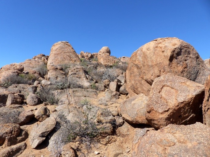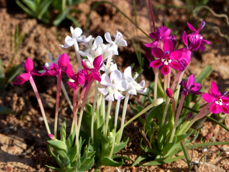 Von Springbok aus nehmen wir die direkte Straße nach Westen Richtung Kleinzee. Nach etwas mehr als einer Stunde Fahrt legen wir den ersten Fotostopp ein. Es ist immer noch sonnig und windstill, also bestes Fotowetter. Wir finden auch gleich ein paar für uns neue Pflanzen, etwa eine Ornithogalum- und eine Lapeirousia-Art. Wir halten uns über eine Stunde auf und finden immer noch Neues. Aber um 10.00 Uhr reißen wir uns los und setzen die Fahrt fort. Schon nach 20 Minuten halten wir an einem frei stehenden Granitberg erneut an und klettern den Hang hinauf.