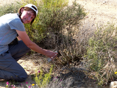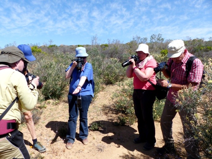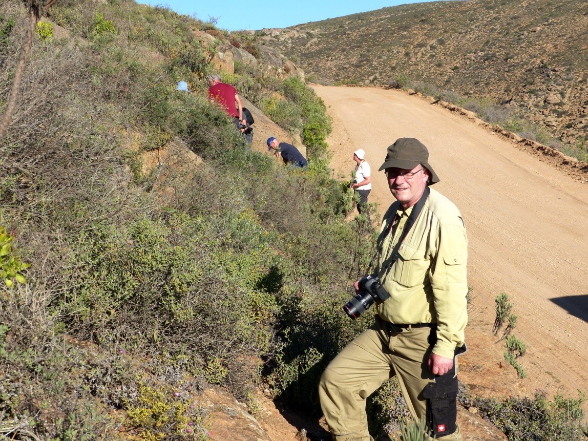 Wir finden ein völlig neues Ökosystem vor, das sogenannte Bokkeveld. Es handelt sich hier um ein von Gletschern vor geologisch längerer Zeit überformtes Felsplateau. Dazwischen eingeschaltet sind flachgründige Verwitterungssedimente in unterschiedlichster Körnung und Dichte. Es liegen Feuchtgebiete mit quietschgelben Nacktschnecken dicht neben trockenen Biotopen, mit beinahe blanken Felsplatten, die nur in den Ritzen ein paar winzige Sukkulenten beherbergen. Und einen halben Meter daneben üppige Strauchgesellschaften der Fynbos-Vegetation. Diese Kleinräumigkeit ist Heimat für unzählige Spezialisten. Hier wachsen mehrere Arten von fleischfressenden Pflanzen, Moosen und andere Feuchtigkeit liebenden Pflanzen fast „Schulter an Schulter“ mit Trockenheitsasketen, wie diverse Crassulaceen oder Mesembs. Alle schwärmen sofort aus und die Zahl der verschiedenen Arten lässt sich kaum erfassen. Das Meiste ist völlig neu für uns. Fährt man dann ein oder zwei Kilometer weiter, gibt es andere Böden mit anderen Pflanzen, sodass die zwei angedachten Stunden bei weitem nicht ausreichen.