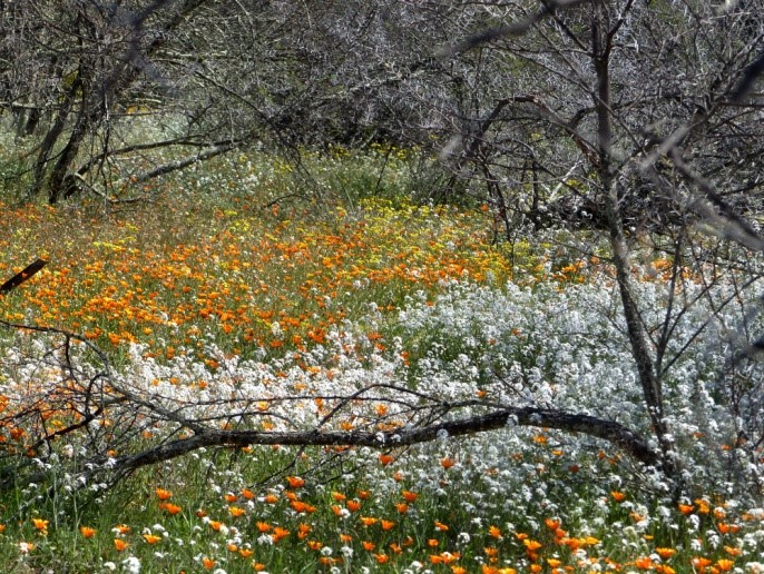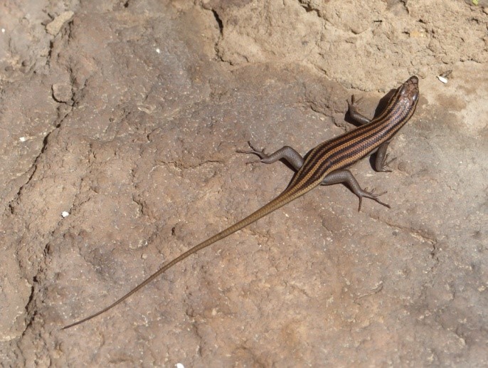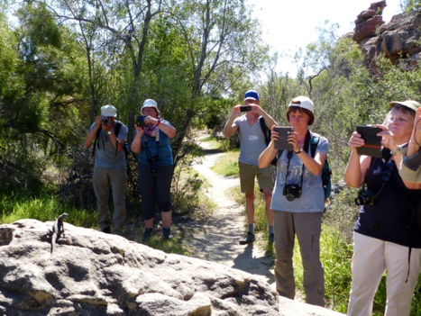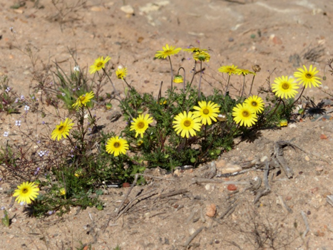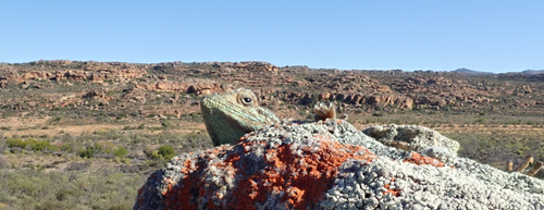 Das Wetter ist sehr warm und fast windstill, aber die Natur erscheint hier oben trotzdem recht frisch. So erleben wir auf dem Weg zu den Felsmalereien überall größere Teppiche mit Blumen in diversen Farben und Arten. Natürlich dominieren hier Geophyten, so auch Mengen von sehr imposanten Ferrarias. Auf den warmen Felsen posieren Agamen im metallic blauen Hochzeitskleid.