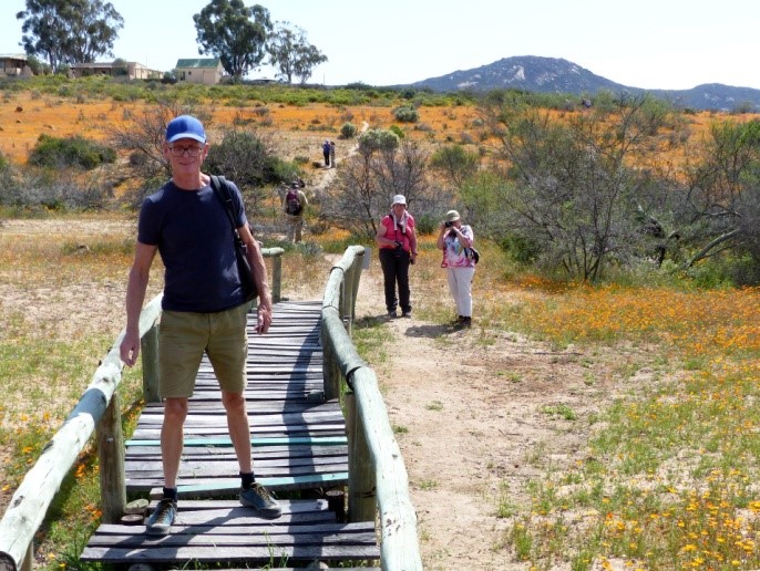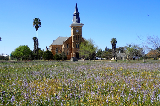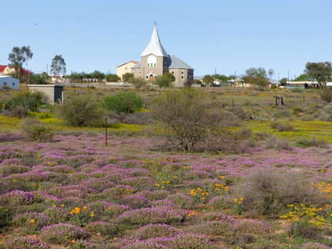 Unterwegs nach Nieuwoudtville beobachten wir noch ein Straußenpaar bei der Balz, dann kehren wir in dem uns bereits von der Hinfahrt bekannten Hotelrestaurant ein und nehmen einen Kaffee mit hausgemachtem Kuchen oder einen kleinen Imbiss zu uns. Die vorgesehene halbe Stunde kann leider nicht eingehalten werden, hier ist das Personal offensichtlich überfordert. So brechen wir erst nach über einer Stunde in den Hantam Botanical Garden auf. Aber vorher besuchen wir noch das Informations-Zentrum und die Kirche im Ortskern, denn davor ergießt sich ein riesiger Blumenteppich aus Ixia in Blau. Dann aber geht es schnell in den Park.